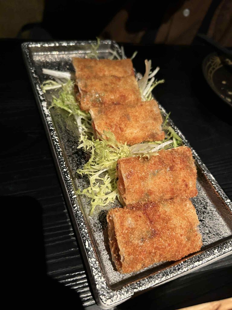 次に印象的だったのが春巻きのような揚げ物。パリッとした皮と旨味たっぷりの具材が絶妙で、軽やかな食感は仕事の疲れを癒してくれる一品でした。